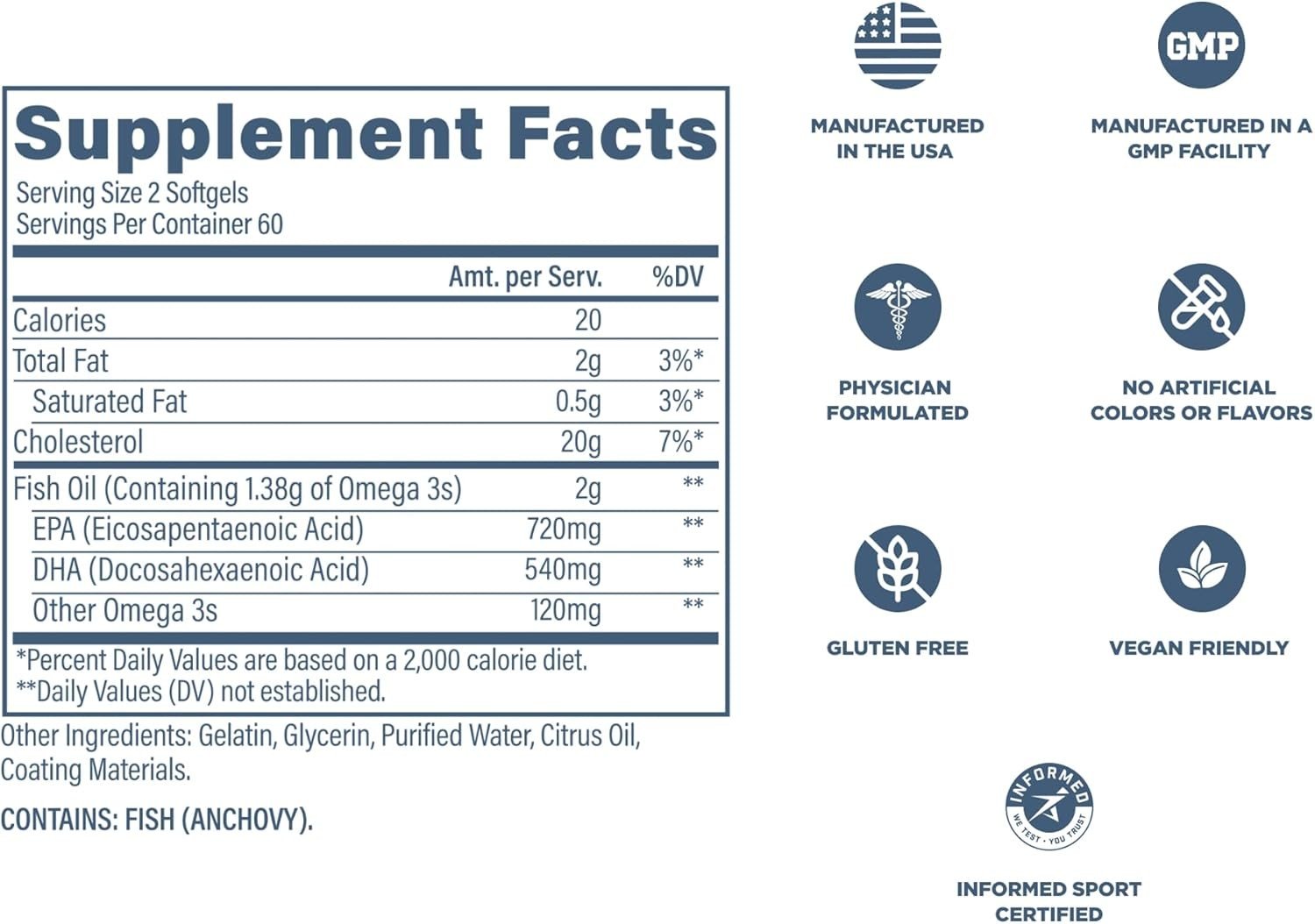 EPA+DHA de alta calidad para soporte cardiovascular, cognitivo y articular. Excelente complemento para atletas con desgaste y esfuerzo constante.