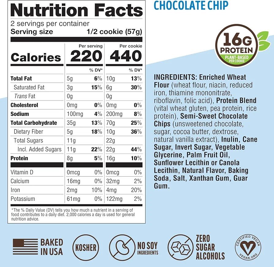 Galleta vegana alta en proteína y fibra, perfecta para un snack práctico que te mantiene satisfecho. No requiere preparación y sabe increíble.